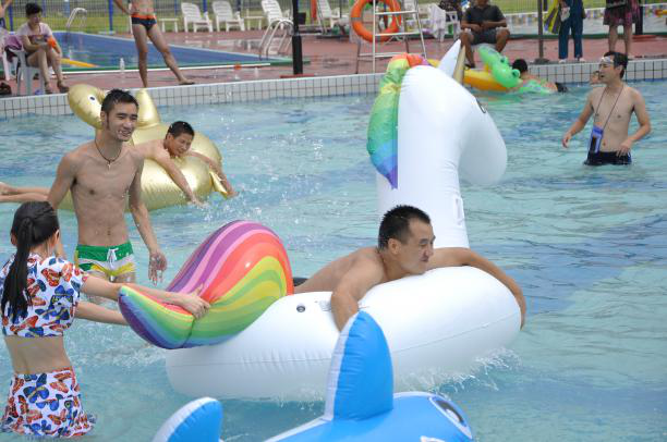隨后,水上趣味接力賽拉開了帷幕。選手們趴在造型各異的動物氣墊上從水上滑梯沖入水中,濺起陣陣浪花,然后奮力將氣墊劃向下一個選手處。把氣墊當(dāng)成小船往前劃非常費力,選手們嘗試了各種方法,有用手劃水的,有用腳蹬的,還有手腳并用的,有的還一不小心掉進了水里,水池邊的圍觀啦啦隊們又一次忍俊不禁的開懷大笑。
